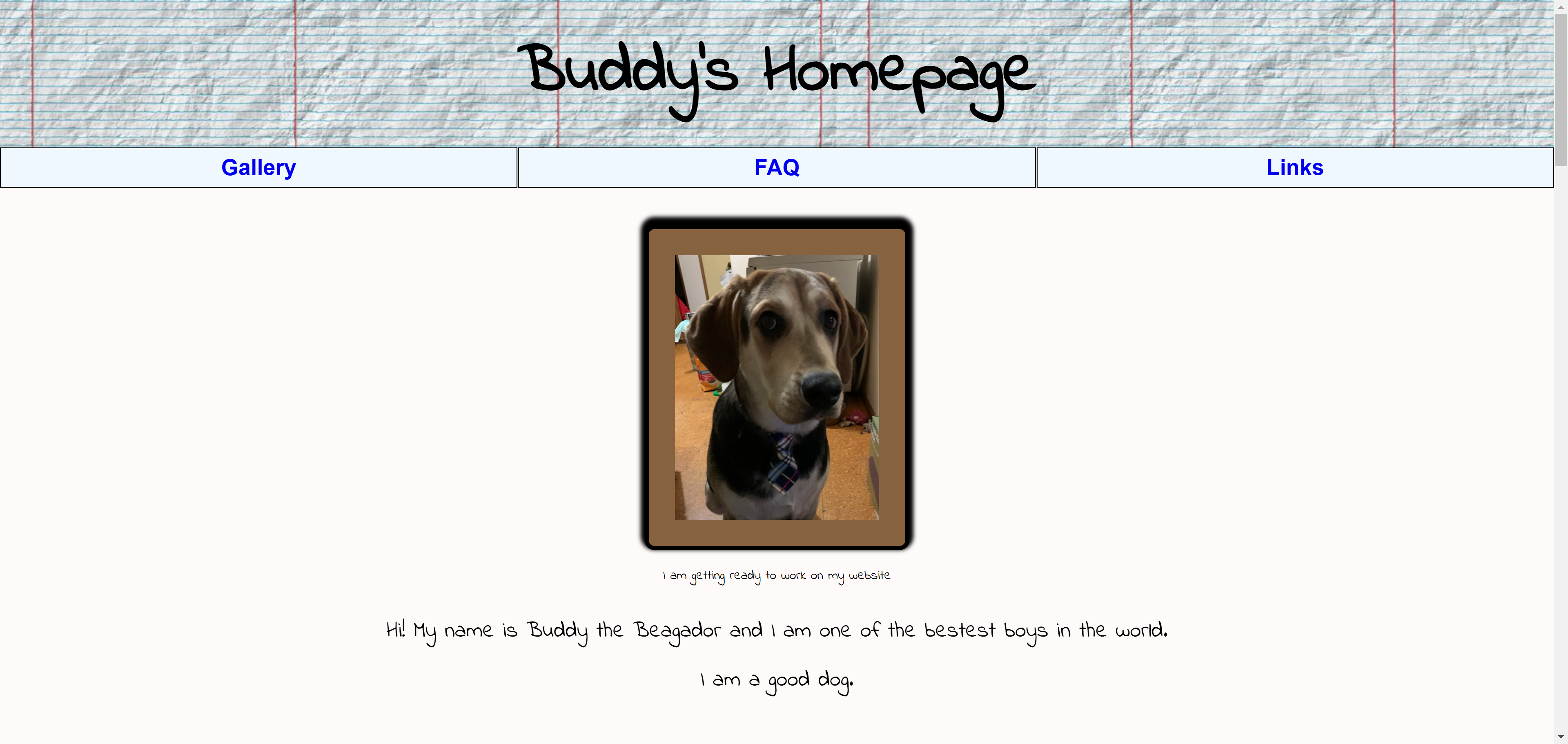 Buddy is my dog, BFF, and business partner. He is an excellent programmer and a shrewd negotiator. He was nice enough to let me be the VP (Vital Person) of GasparinTech. He is the CEO (Canine Executive Officer). Written in HTML and CSS